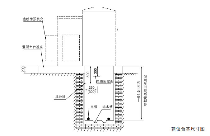 組合式變電站安裝在水平混凝土臺(tái)面上,臺(tái)面應(yīng)保證承受其重量.建議臺(tái)基尺寸 ( 見(jiàn)下圖 )