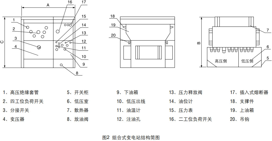 產(chǎn)品結(jié)構(gòu)特點(diǎn)(原理圖見(jiàn)圖1、結(jié)構(gòu)圖見(jiàn)圖2) 變壓器器身與高壓開(kāi)關(guān)設(shè)備分油箱裝配,兩者僅電氣連接而油相互隔離。帶電操作負(fù)荷開(kāi)關(guān)產(chǎn)生的電弧只能使負(fù)荷開(kāi)關(guān)油箱中的油變黑甚碳化而不影響變壓器中油的質(zhì)量。損耗小、過(guò)載能力強(qiáng)。可用于環(huán)網(wǎng)供電、雙電源供電或終端供電系統(tǒng)中,供電方式轉(zhuǎn)換方便、運(yùn)行可靠。 本產(chǎn)品具有缺相保護(hù)裝置,當(dāng)缺相時(shí),可自動(dòng)同時(shí)斷開(kāi)變壓器的進(jìn)線負(fù)荷開(kāi)關(guān)和低壓側(cè)斷路器(總開(kāi)關(guān)),也可只斷開(kāi)高壓側(cè)負(fù)荷開(kāi)關(guān)或低壓側(cè)斷路器。 |